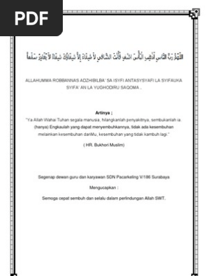 Allahumma Robbannas Adzhibilba from demo.pdfslide.net Allahumma inni auzubika manal hammi va hazan va auzubika minal ajzi va kasal va auzubika minal jubni va buxl va auzubika min g'olabatil dayni va qoxri rijal!!! Ya allah tuhannya manusia, hilangkanlah rasa sakit ini sembuhkan lah, engkau. 239 631 просмотр • 7 июн. Silakan share utk mendapatkan seramai ramainya doa. Lalu tarik dari pusat rasa sakitnya ke arah mulut, ulangi hal ini sampai rasa sakit tersebut. Ya allah tuhannya manusia, hilangkanlah rasa sakit ini, sembuhkan lah. Tiada siapa yg dpt menyembuhkan kecuali allah. Allahumma syifaan illa syifauka syifa alla yughadiru sakomaa.