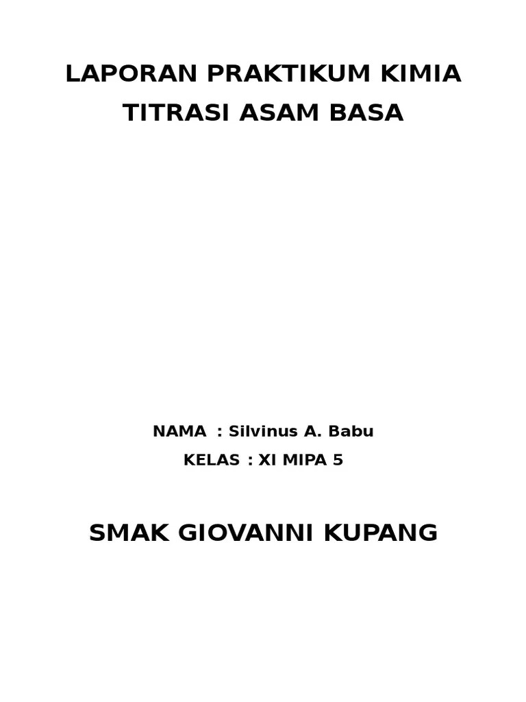 Laboratorium kimia sma negeri 1 talun. Indikator yang digunakan pada titrasi asam basa adalah indikator yang mempunyai trayek perubahan. Titik ekivalen pada titrasi asam basa adalah pada saat dimana sejumlah asam tepat di netralkan oleh sejumlah basa. Laporan praktikum kimia titrasi asam basa. Bahan yang digunakan saat praktikum "titrasi asam basa" antara lain larutan hcl 0,1 n sebanyak 100 ml, larutan naoh, indikator fenolptalein. Laporan praktikum titrasi asam basa, praktikum titrasi asam basa, strandarisasi larutan naoh, pembuatan larutan naoh, titrasi hcl dengan naoh. Laporan praktikum kimia titrasi asam basa. Laporan praktikum titrasi asam basa tugas kimia sma negeri 1 bajawa titrasi asam basa. Titrasi asam basa merupakan prosedur penting dalam analisis kimia untuk. Laporan praktikum titrasi asam basatujuan 1. Budi rahayu selaku guru kimia sma negeri 2 demak yang telah berkenan membantu dan bekerjasama dalam melaksanakan penelitian. 3.mempelajari dan memahami titrasi asam basa menstandarisasi naoh de. Erma dwi sandra (10) 2.